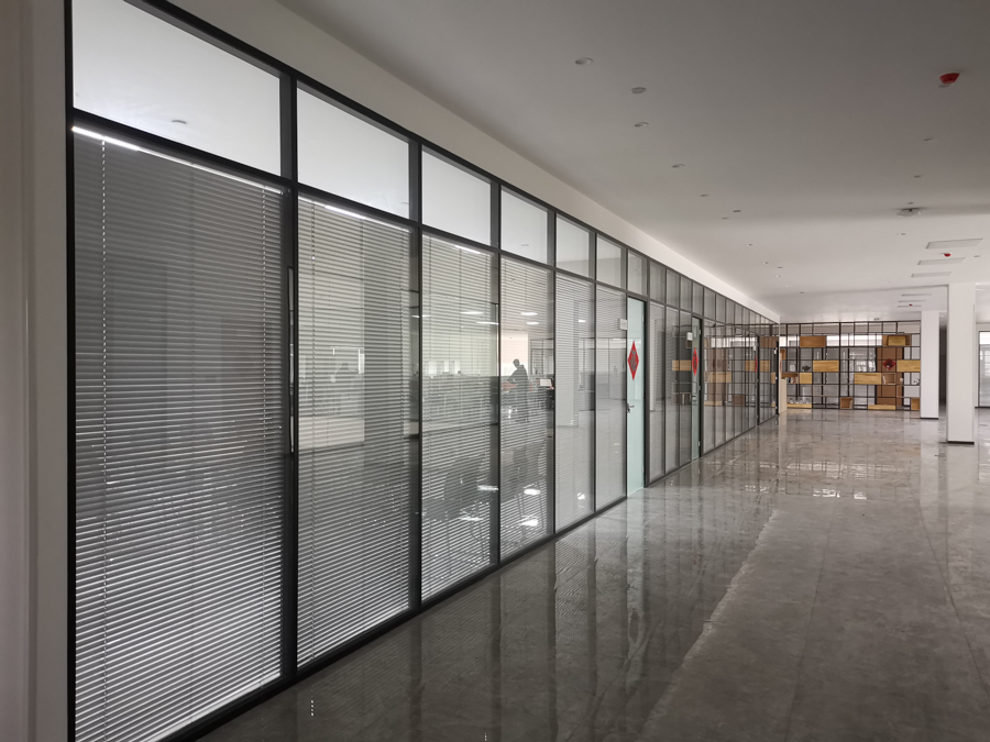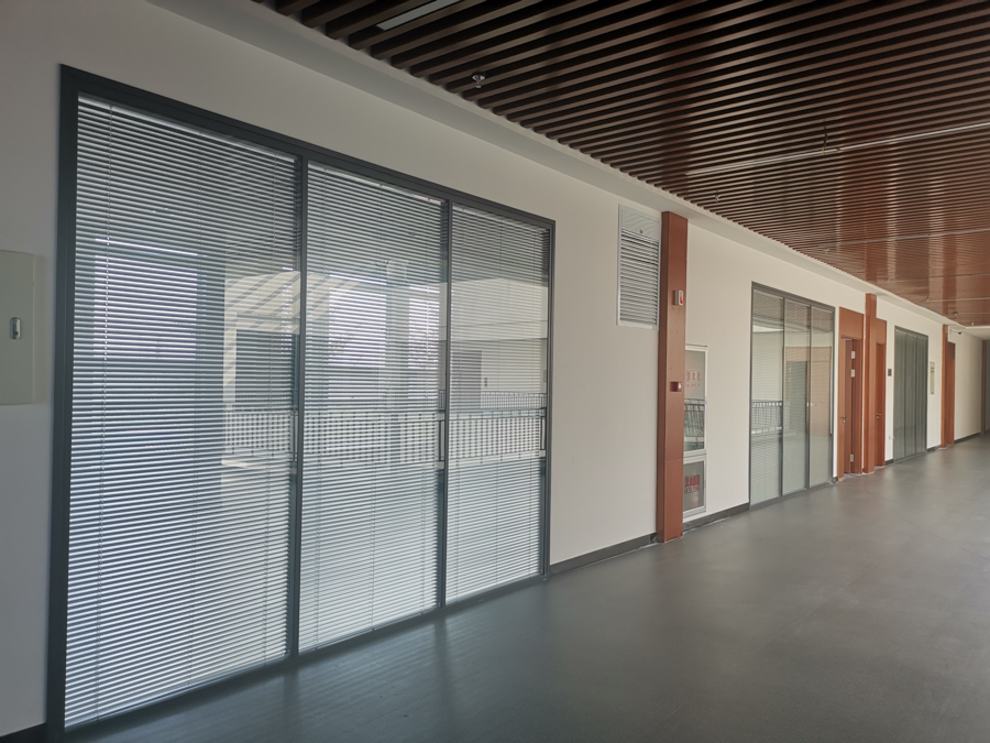海爾空調(diào)水機項目:HX-85款氧化銀色,雙層5mm鋼化玻璃內(nèi)置百葉隔斷,隔斷配套12mm鋼化玻璃門扇。電梯廳自動門系統(tǒng)采用松下自動門及門禁系統(tǒng)。
