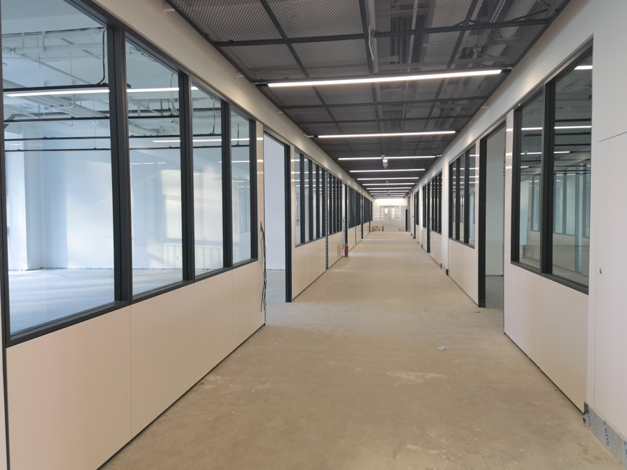 海爾全球中心項目:HX-85款氧化銀色單層10mm鋼化玻璃,隔斷配套10mm鋼化玻璃門扇。